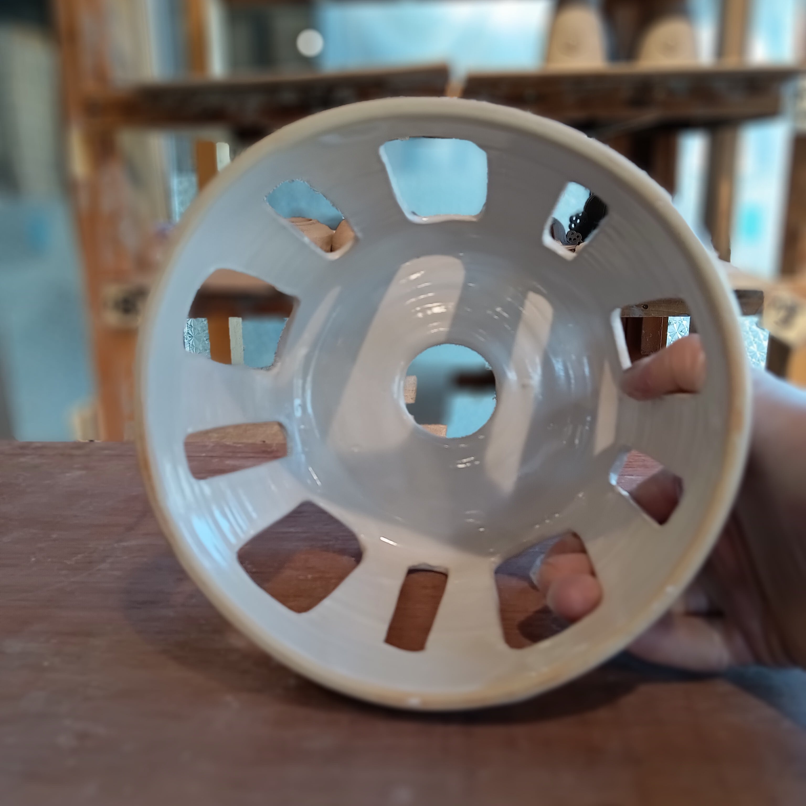 白い釉薬の陶器シェードに丸い開口部があり、そこにステンドグラスをはめ込む構造になっていますね。光が入るとかなり雰囲気が出そうです。